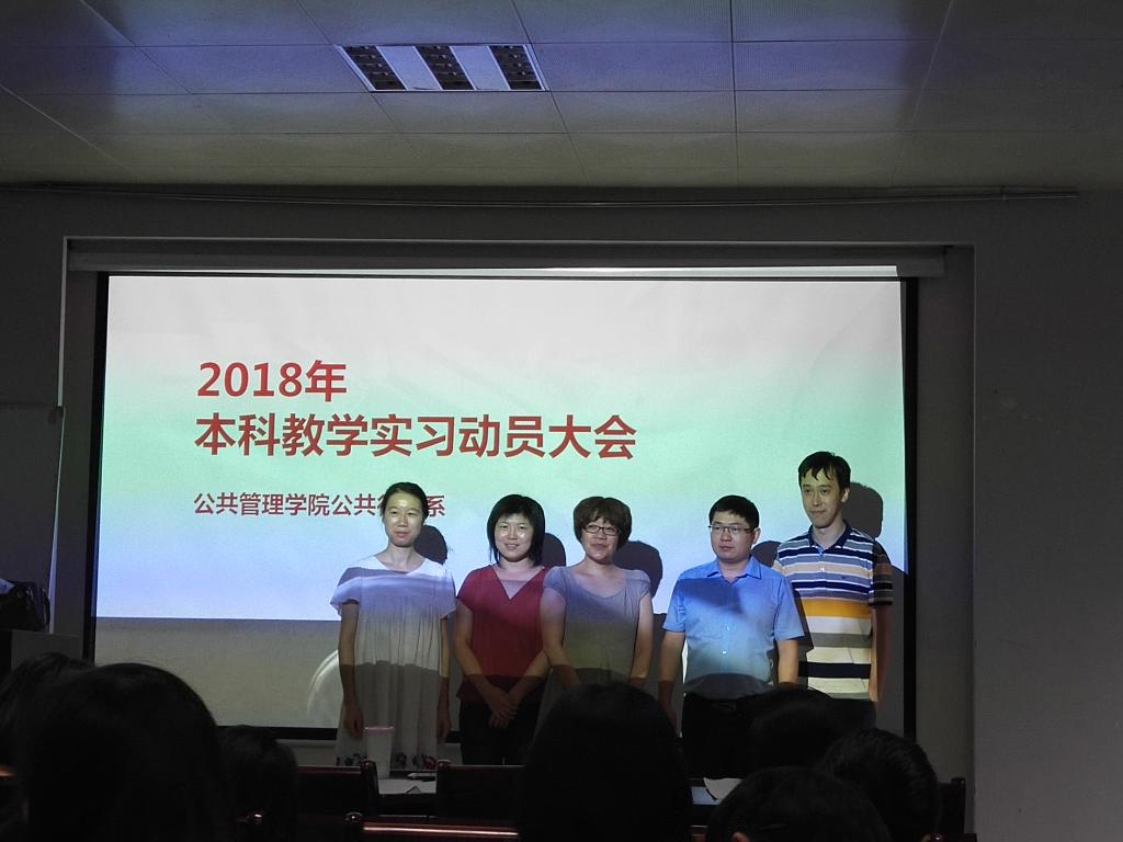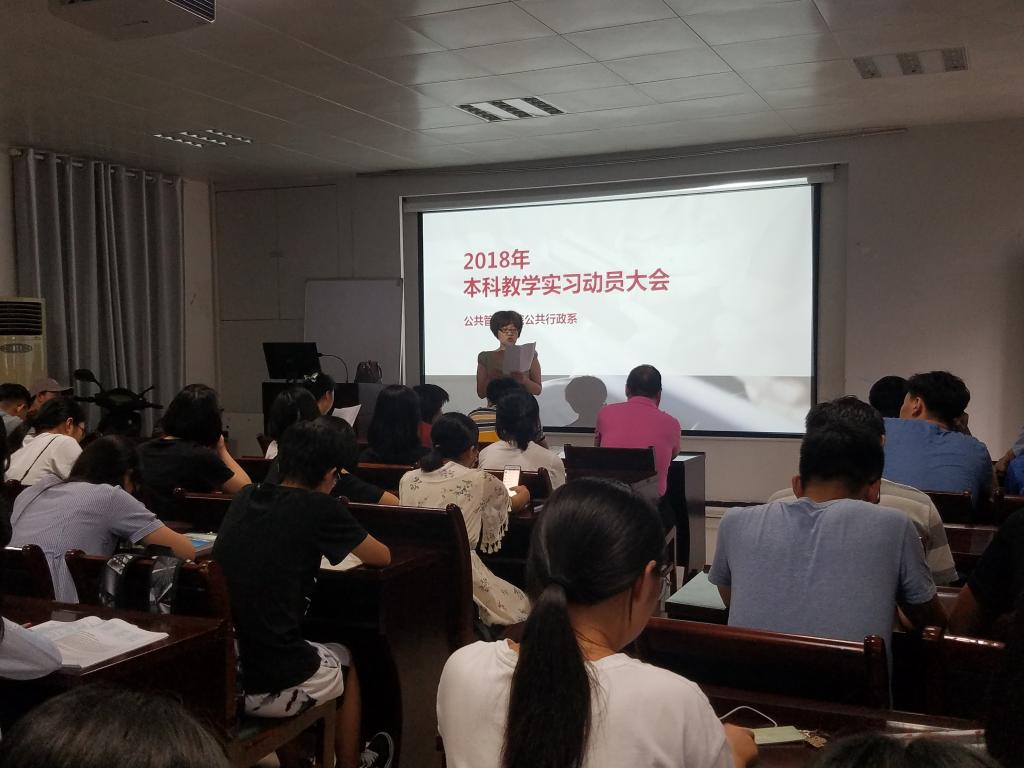 (通讯员 张士菊 李想)2018年6月22日,我院公共行政系在实验楼101召开了2018年本科教学实习动员大会。出席会议的有秭归实习的带队队长田家华教授、陈星博士,洪山区政府实习的指导老师苏黎兰博士,孝感实习的指导老师黄砺博士,以及2016级的行政管理和公共事业管理专业的全体本科生。本次会议由公共行政系系主任李世祥教授主持。