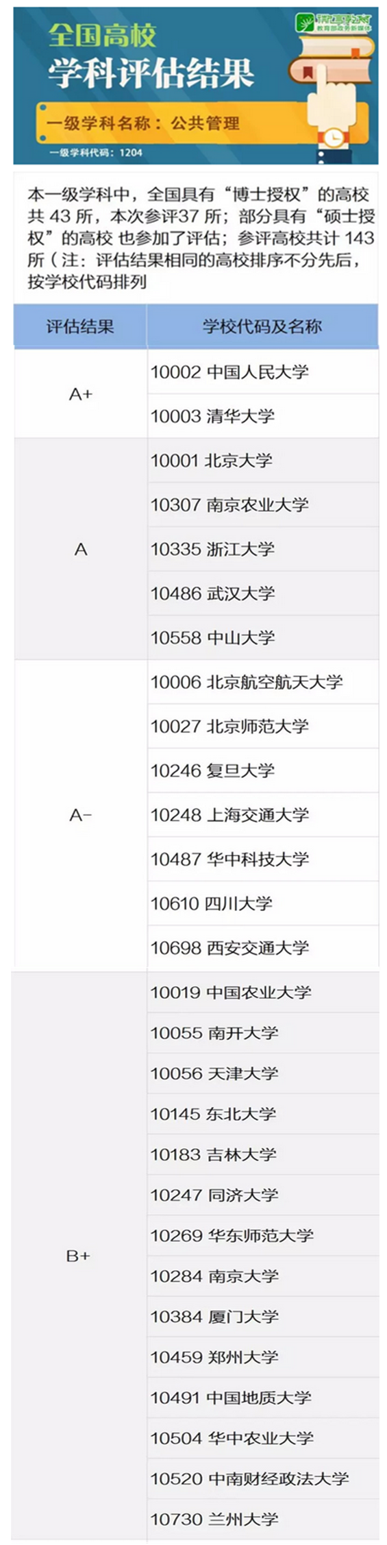 2017年12月28日,教育部学位与研究生教育发展中心公布了全国第四轮学科评估的结果。全国共有143所高校参加了本轮公共管理一级学科评估,我校公共管理学科在本轮学科评估中被评为B+学科,在参评高校中并列排第15位,居全国前10%-20%行列,是我校除地质学、地质资源与地质工程两个A+学科之外最好的学科之一。