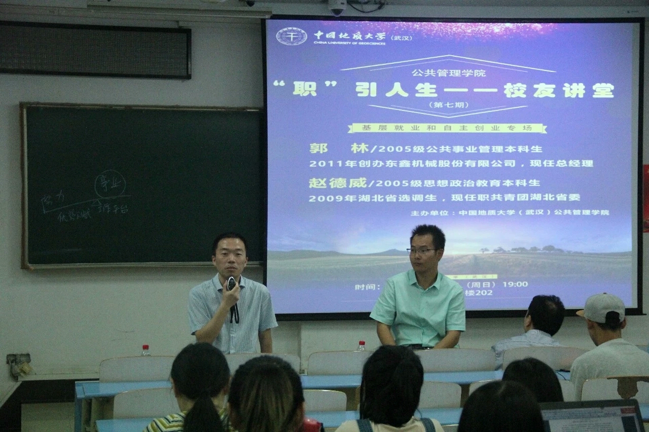 2018年5月27日晚,365足球外围投注网站“职”引人生——校友讲堂(第七期)于北区综合教学楼202室成功举行。此次活动特邀两位院友担任分享嘉宾,他们分别是:东鑫机械股份有限公司总经理郭林,以及任职于共青团湖北省委的赵德威。本次活动由院党委副书记胡文勤主持。本次活动分为三个阶段。胡文勤首先解读了就业形势与政策,以大学生就业市场供需双方的意愿性错位为例阐述了当前总量矛盾突出、…